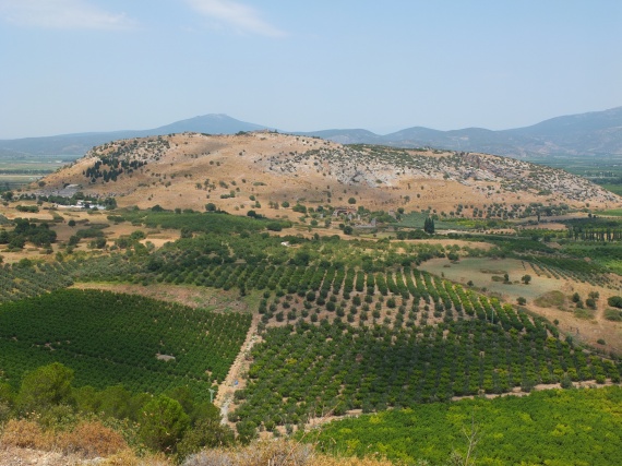 聖母マリアの家は山の上のほうにあり、その途中からの眺めは綺麗でした。正面の山のふもとにあるのがエフェソスの遺跡です。規則正しく植わっている木は、果樹園の果物の木です。