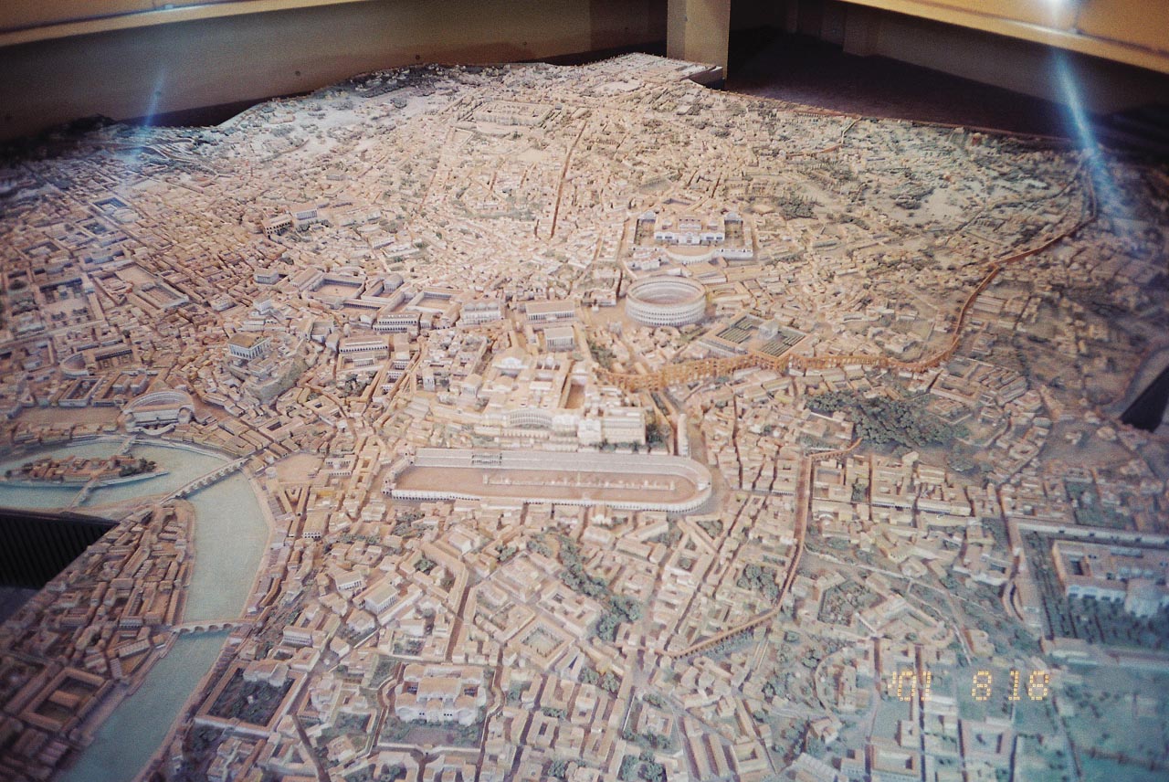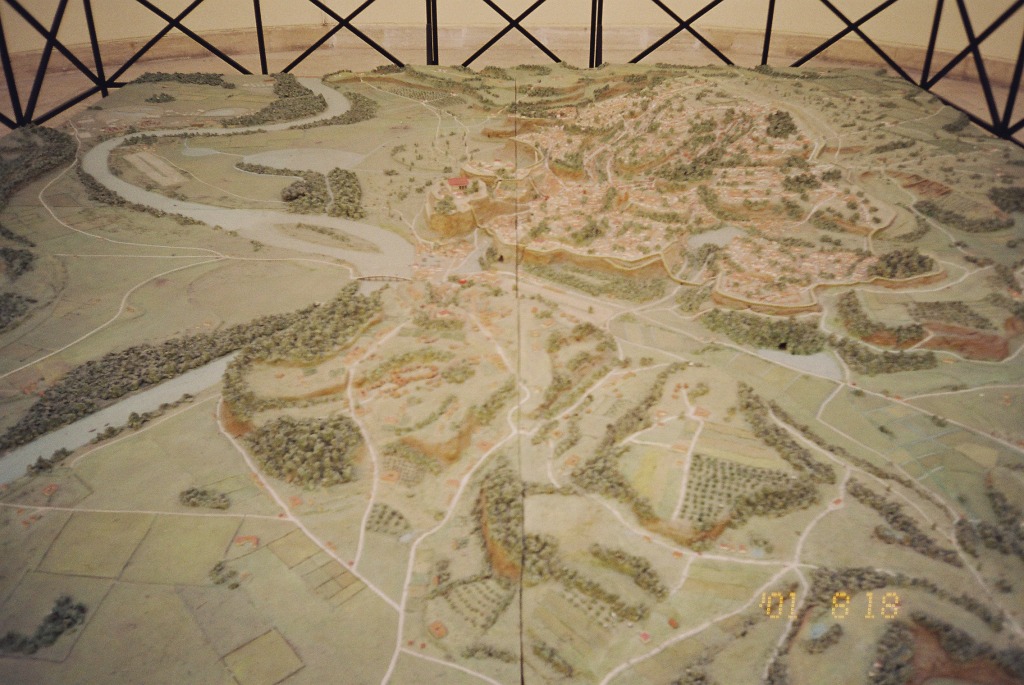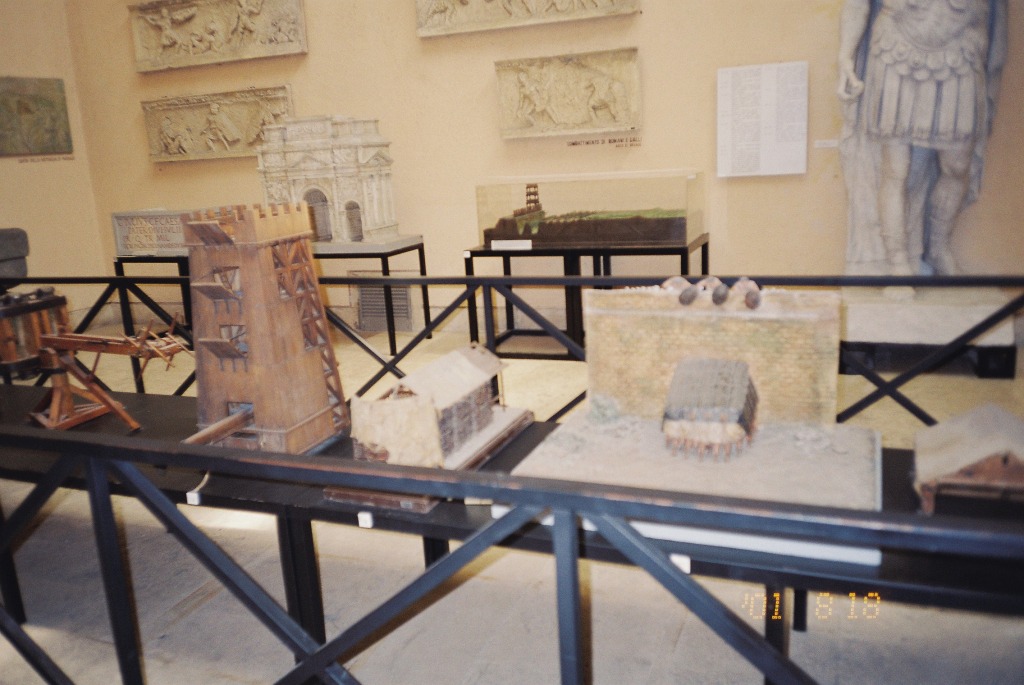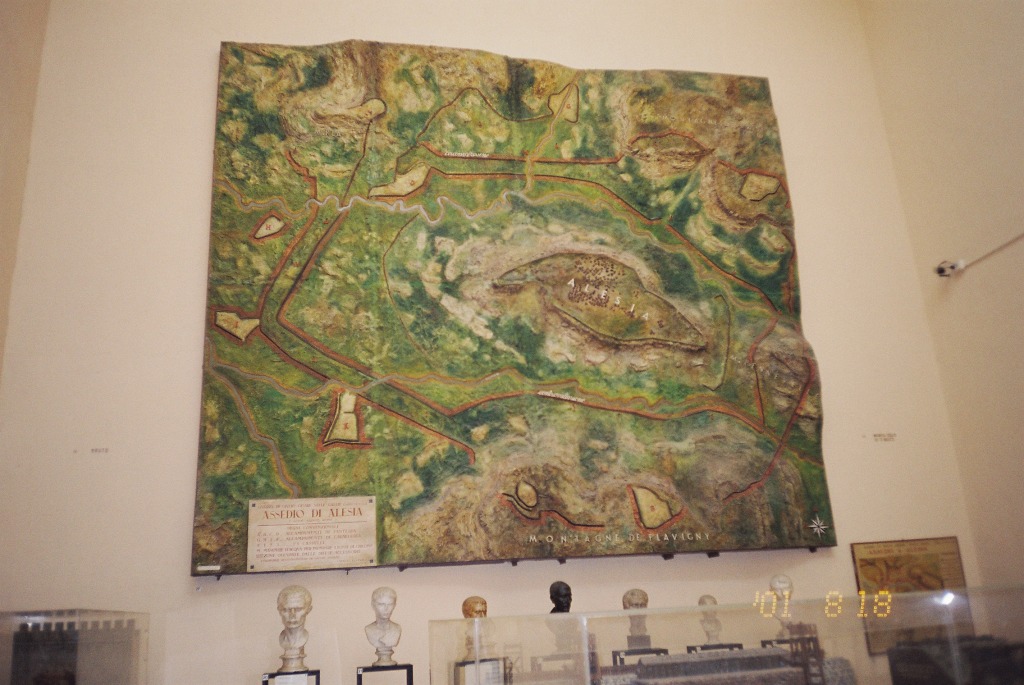左:カエサルによるガリア戦役のクライマックス、アレシアの戦いの模型。中央の砦に立てこもるガリア軍を包囲するローマ軍を、さらに包囲するガリア連合軍の模様。